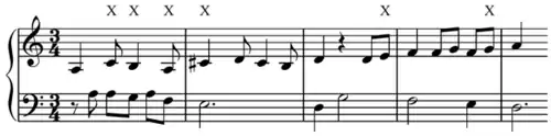 Due to the different tuning systems compared to modern times, the minor seventh and major ninth were "harmonic consonances", meaning that they correctly reproduced the interval ratios of the harmonic series which softened a bad effect.[52] They were also often filled in by pairs of perfect fourths and perfect fifths respectively, forming resonant (blending) units characteristic of the musics of the time,[53] where "resonance" forms a complementary trine with the categories of consonance and dissonance. Conversely, the thirds and sixths were tempered severely from pure ratios, and in practice usually treated as dissonances in the sense that they had to resolve to form complete perfect cadences and stable sonorities.[54]