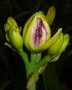 Buds of a Hemerocallis cultivar with a short globular bud (lower left) distorted by infestation of the hemerocallis gall midge, compared with normal cylindrical bud at centre