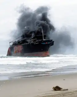 On February 4, 1999, a Japanese ship named the New Carissa ran aground on a beach 2.75 miles (4.3 km) north of the entrance to Coos Bay, drawing international attention to the area. The New Carissa was empty of cargo at the time, heading for the Port of Coos Bay to pick up wood chips. When the captain was told that the weather was too severe for the ship to enter port, he anchored his ship close by. The crew put out only one anchor, and it appears that this was probably on too short a chain to be effective. The subsequent US Coast Guard investigation found several other aspects of the ship's company's handling of the situation to have been poor, leading to the conclusion that human error caused the grounding. Seventy thousand US gallons (260 m3) of #6 crude oil were spilled by the vessel, with a further 165,000 to 255,000 gallons (625 to 965 m3) set alight via explosives and liquid napalm, by the Army Corps of Engineers, over the course of weeks. The explosives, the heat from the burning oil and the beating of the Pacific Ocean on the ship are what eventually caused the New Carissa to break in two.
