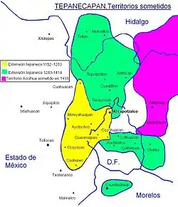 - ^ In fact there are no known places called "Tepan". Tepanohuayan however, in addition to its concept as a mythical place, is used in colonial documents to refer to several tepanecas cities; this is how references are made of Azcapotzalco-Tepanohuayan, Tlacopan-Tepanohuayan, Coyohuacan-Tepanohuayan, and even near Atlacuihuayan there was a town with that name. Perhaps its value is due to the condition of being on the eastern shore of the Texcoco Lake, at the place where people boarded a vessel to cross (pasar) to the other side.
