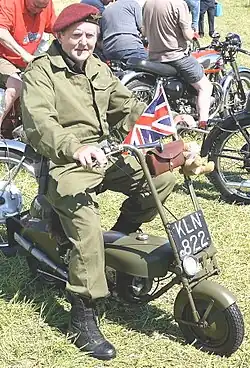 British Paratrooper re-enactor wearing a Parachute Regiment beret on a Corgi mini motorcycle in 2010 | |