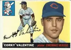 Valentine entered professional baseball in 1948 in the Cincinnati farm system. After spending three years in the low minor leagues, and missing 1951 and 1952, he led the 1953 Sally League in earned run average (2.11) and helped the Columbia Reds win the league championship. The following year, he made the parent Redlegs' regular-season roster. Taking a turn in Cincinnati's starting rotation, he appeared in 36 games as a rookie, with 28 starts. His 12 victories put him in a three-way tie (with Joe Nuxhall and Art Fowler) for most on the Redleg staff, and he paced all Cincinnati pitchers with three shutouts; he also threw seven complete games, second-most on the club.[1] However, plagued by arm miseries,[2] Valentine was demoted to the Redlegs' Triple-A Havana Sugar Kings affiliate after May 29, 1955.