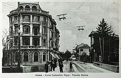 Shortly after its construction, the avenue became the most popular route to enter Ivrea, replacing the road that passes through the Borghetto quarter and reaches the city via the old Ponte Vecchio.[1] At the same time, the cultivated lands on either side of the new road, enhanced by the construction, the traffic around the railway station, and the panoramic position overlooking the river and the city center,[1][3] were developed with new and elegant villas. Among the first were Villa Luisa, built by the Borgetti family in the 1860s, and Villa Demaria in 1897.[1][3] The appearance of this section of the avenue changed drastically between 1906 and 1909 when Palazzo Ravera was built on the steep terrain overlooking the river to the east of the road.[1][3]