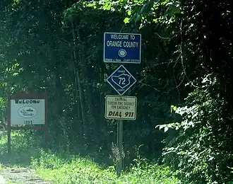 County routes in Orange County, New York, are maintained by the Orange County Department of Public Works. Most routes are signed with the Manual on Uniform Traffic Control Devices-standard yellow-on-blue pentagon route marker; however, some routes are still signed with white-on-blue diamond-shaped route markers that predate the introduction of the standard marker. These markers are unique to Orange and Ulster Counties and display the route's designation inside an outline of the county. Route numbers are not assigned in any fixed pattern.