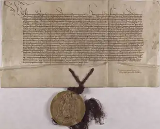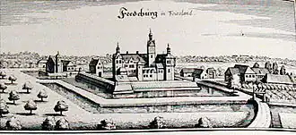 Meanwhile, Ulrich continued to try to further weaken Hamburg's authority in East Frisia. However, it was time for Ulrich to turn to other rulers to strengthen his own position in East Frisia and to finally free his subjects from the yoke of Hamburg. To achieve this, Ulrich therefore turned to the emperor of the Holy Roman Empire: Frederick III. On 14 June 1463, the Emperor only recognized his rule in Norden. His possessions in the Norderland were transformed into the County of Norden. A second attempt, however, was more successful. In exchange for a large sum of money, Ulrich was proclaimed "Count in Norden, Emden and Emisgonien in East Frisia" up to the Weser on October 1, 1464.[10] However, Ulrich had to explicitly recognize the freedoms that his subjects had known for centuries under the guise of Frisian freedom. In return, the East Frisians had to recognize Ulrich as their lord. With this appointment, East Frisia was now better protected against claims from, among others, the Prince-Bishopric of Münster; they had a centuries-old claim to the area. After lengthy negotiations, the claims and demands of Hamburg were also swept off the table once and for all. Ulrich and several other chieftains were knighted later that year in the Franciscan church of Emden. Two years later, in 1466, the life of Ulrich I, the first Count of East Frisia, came to an end. Under his leadership, an area that had been plagued by violence for decades was transformed into a territorially coherent whole that was henceforth ruled by the Cirksena dynasty. He had thereby elevated his family above the many other East Frisian chieftains.[11]