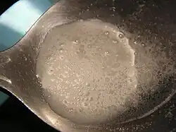 Crack cocaine is usually heated in a drug pipe until sublimation occurs at a relatively low temperature (about 90°C) and the vapor is inhaled.[4][23][24] This process is commonly referred to as "freebasing." Although commonly called "smoking," this method actually involves vaporizing the drug rather than burning it. If crack cocaine is burned directly, such as in a regular tobacco pipe, roll-your-own cigarette, or aluminum foil[25] higher temperatures may lead to decomposition of the active compound, reducing its effectiveness. This is why vaporization at lower temperatures, rather than combustion, is the preferred method for administration. While no formal studies have specifically quantified the extent of drug loss during combustion, users commonly choose to vaporize crack cocaine in order to maximize its effects and potentially avoid wasting money. Additionally, vaporizing is generally considered less harsh on the throat and lungs compared to smoking crack through a tobacco pipe, as combustion can produce more irritating and toxic by-products.