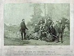 Finally, these photomontages take considerable liberties with historical facts. The execution of the hostages at the Roquette prison was indeed ordered by Théophile Ferré on May 24, 1871, but he was not present at the scene, contrary to what Appert's image suggests.[40] The scene is silent on the confusion of the moment, and the Communards' determination to prevent the execution.[41] The Rue Haxo hostages were not executed all at once, as the photomontage shows, but in small groups, in great confusion.[12] More significantly, Generals Thomas and Lecomte were shot one after the other, summarily and by the angry: Appert's photomontage, itself inspired by an engraving in L'Illustration, gives the impression of a joint execution by an organized platoon, as if implementing a decision of the Paris.[40]