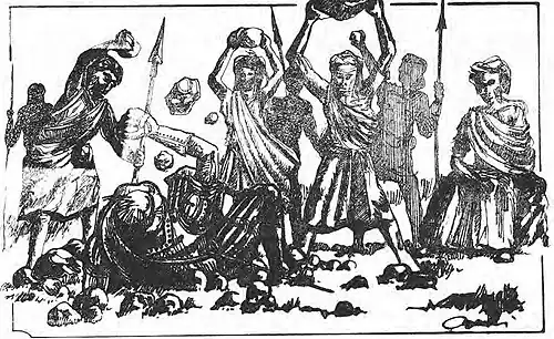 Leaving 30 men behind to bring the horses, Gama led his victorious men back to Wofla, to find Ahmad Gragn in position to attack that next morning. Having successfully petitioned the governor of Zabid in South Arabia, as well as offering "much money" and submission to the official, Gragn received 2900 musketeers (2000 from Arabia and 900 handpicked Ottomans), many more than Gama had.[20] Despite their bravery, the Portuguese were heavily defeated on 28 August at the Battle of Wofla, with only 170 surviving the assault (counting the 30 men escorting the horses from the Hill of the Jews). Gama, his arm broken from a bullet, was captured that night with 14 companions by an Adal patrol.[21] A British historian Clements Markham claimed in the 19th century that Gama's capture was due to his refusal to retreat in order to find an attractive lady with whom he had fallen in love, after capturing her at the Battle of the Hill of the Jews.[22]