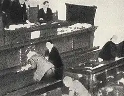 The HSS left the government in January 1927.[20] Radić resumed pursuit of resolution of the Croatian question by advocating unification of Croatian lands including Slavonia and Dalmatia into a single self-governing unit and stopping Italian immigration by abolishing the 1925 Treaty of Nettuno.[21] In November, the HSS formed the Peasant-Democratic Coalition with the Independent Democratic Party (Samostalna demokratska stranka, SDS), the most popular party among the Serbs of Croatia.[22] Tense relations between the opposition and the government deteriorated further until a shouting match in the parliament escalated to the point where NRS deputy Puniša Račić shot several HSS parliament members killing two and wounding three including Radić on 20 June 1928. Radić suggested that the shootings were a result of a regime plan and that the HSS should abandon pacifism. Soon afterwards, Radić died of the wounds on 8 August. Following the assassinations, the Yugoslav state lost any legitimacy among Croats – who appeared united in demands for overhaul of the state.[23] HSS thus became the only major political party among Croats.[24] Vladko Maček was elected to replace Radić almost immediately after his death.[25]