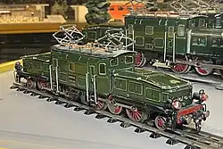 The first evidence of the nickname crocodile locomotive refers to the green Märklin model railway locomotives in gauge 0, item CCS 66/12920, as well as in gauge 1, item CCS 66/12921, which snake through the curves like a reptile when running through switch roads and counter curves, and are first referred to as such in the Märklin catalogue of 1933/1934.[1] They are a reproduction of the Ce 6/8II and Ce 6/8III freight locomotives of the Swiss Federal Railways (SBB), which were put into service starting in 1919.