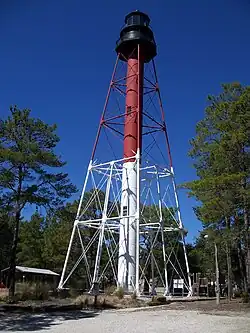 The Crooked River Lighthouse, built in 1895, replaced three lighthouses on Dog Island that over the years were destroyed by storms. The tower was fitted with a 4th Order, bivalve Fresnel lens constructed in Paris, France in 1894. The lightstation grounds originally included a house for both the Keeper and the Assistant Keeper, and several outbuildings. At first the lighthouse was painted solid dark red except for the black lantern room. Later (at the end of 1901) the lower half was painted white to offset it from the surrounding pine forest. This is the same daymark seen on the lighthouse today - the lower half white, the upper half red and a black lantern room. After being electrified in 1933, the lighthouse was automated and unmanned in 1952. In 1964 the two houses and all outbuildings were sold and removed from the site. The original 4th Order lens was removed by the Coast Guard in 1976, due to mercury leakage in the float container. The lens was replaced by a modern optic and this beacon remained in operation until the lighthouse was decommissioned in 1995.[4][5]