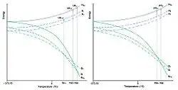 In terms of thermodynamics, two types of polymorphic behaviour are recognized. For a monotropic system, plots of the free energies of the various polymorphs against temperature do not cross before all polymorphs melt. As a result, any transition from one polymorph to another below the melting point will be irreversible. For an enantiotropic system, a plot of the free energy against temperature shows a crossing point before the various melting points.[59] It may also be possible to convert interchangeably between the two polymorphs by heating or cooling, or through physical contact with a lower energy polymorph.