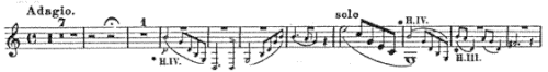 The cued instrument is indicated with text and the cue notes are smaller than the rest. The stems of cue notes all go in the same direction and cue notes are transposed into the key of the part entering.[1]