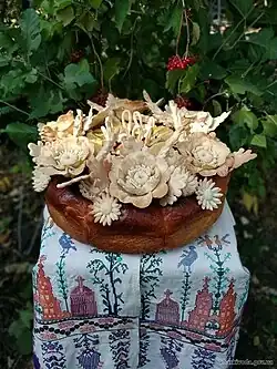- Korovai: a round, braided bread, similar to the kolach. It is most often baked for weddings and its top decorated with birds and periwinkle.
