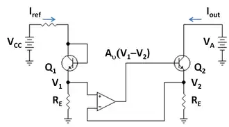 - ^ An idealized version of the argument in the text, valid for infinite op amp gain, is as follows. If the op amp is replaced by a nullor, voltage V2 = V1, so the currents in the leg resistors are held at the same value. That means the emitter currents of the transistors are the same. If the VCB of Q2 increases, so does the output transistor β because of the Early effect: β = β0(1 + VCB / VA). Consequently the base current to Q2 given by IB = IE / (β + 1) decreases and the output current Iout = IE / (1 + 1 / β) increases slightly because β increases slightly. Doing the math,