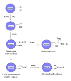 Cyanogen bromide is often used to immobilize proteins by coupling them to reagents such as agarose for affinity chromatography.[5] Because of its simplicity and mild pH conditions, cyanogen bromide activation is the most common method for preparing affinity gels. Cyanogen bromide is also often used because it reacts with the hydroxyl groups on agarose to form cyanate esters and imidocarbonates. These groups are reacted with primary amines in order to couple the protein onto the agarose matrix, as shown in the figure. Because cyanate esters are more reactive than are cyclic imidocarbonates, the amine will react mostly with the ester, yielding isourea derivatives, and partially with the less reactive imidocarbonate, yielding substituted imidocarbonates.[6]