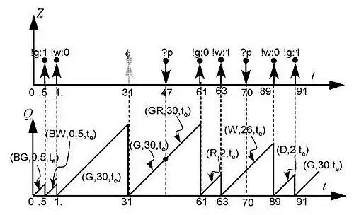 Fig.3. shows a state trajectory associated with an event segment of the SP-DEVS model shown in Fig. 2. The top of Fig.3. shows an event trajectory in which the horizontal axis is a time axis so it shows an event occurs at a certain time, for example, !g:1 occurs at 0.5 and !w:0 at 1.0 time unit, and so on. The bottom of Fig. 3 shows the state trajectory associated with the above event segment in which the state is associated with its lifespan and its elapsed time in the form of . For example, (G, 30, 11) denotes that the state is G, its lifespan is and the elapsed time is 11 time units. The line segments of the bottom of Fig. 3 shows the time flow of the elapsed time which is the only one continuous variable in SP-DEVS.