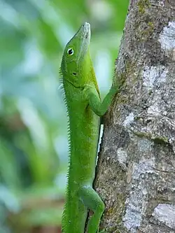 The willingness of many anoles of living close to humans in heavily altered habitats have made them common.[7] Some anoles can occur in very high densities, as illustrated by the Saint Vincent bush, Puerto Rican bush and spotted anoles where it has been estimated that there locally are almost 28,000 individuals per hectare (11,500 per acre) in the first species and at least 20,000–21,000 per hectare (8,000–8,500 per acre) in the last two.[14][207] However, in most species the density is lower and in rare anoles it can be well below 100 individuals per hectare (40 per acre).[14] Some are restricted to specific habitats such as primary rainforest, making them more vulnerable. In a review in 2017, it was found that more than 50 anole species had a known total range that covered 100 km2 (40 sq mi) or less around their type locality.[208] As of April 2018, only 90 anoles, equalling less than one-quarter of the total number of recognized species, had been rated by the IUCN. Most of these are either least concern (not threatened) or data deficient (limited available data prevents an assessment), but 7 are considered vulnerable, 14 endangered and 1 critically endangered.[209] Typical threats to these are habitat loss from both humans and extreme weather, or competition/predation by introduced species. For example, the Finca Ceres anole, a critically endangered species only known from a single unprotected location in Matanzas Province, Cuba, has suffered habitat loss both due to hurricanes and expanding agricultural land.[210] A. amplisquamosus, a critically endangered species only known from highland forest in the Cusuco National Park region of Honduras, was common in the early 2000s, but by 2006 it had experienced a drastic decline and was only infrequently encountered. A clear explanation for this is lacking,[211] although it may be related to habitat loss due to human development and agriculture.[212] Similarly, A. landestoyi, which only was described in 2016 and has not been rated by the IUCN, is restricted to the Loma Charco Azul reserve in Hispaniola, but it is seriously threatened by continuing illegal habitat destruction by slash-and-burn agriculture, livestock grazing and production of wood charcoal.[43][213] Certain highly localized species can be threatened by other anoles. The Cook's anole, found only in southwestern Puerto Rico and considered endangered by the Puerto Rico Department of Natural and Environmental Resources, faces habitat loss and fragmentation from human development, predation by introduced species (especially cats and rats) and direct competition from a more widespread native, the Puerto Rican crested anole.[14][125][214] The Puerto Rican crested anole has also been introduced to Dominica where it locally is outcompeting the endemic Dominican anole, having already largely displaced the South Caribbean ecotype (traditionally subspecies Anolis o. oculatus), which possibly may require a captive breeding program to ensure its survival.[215][216]