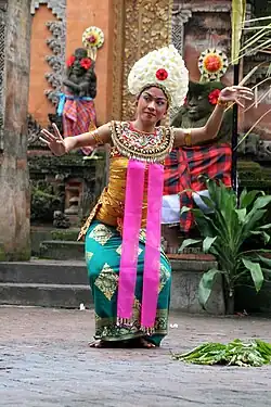 Indonesian dances reflect the richness and diversity of Indonesian ethnic groups and cultures. There are more than 1,300 ethnic groups in Indonesia, it can be seen from the cultural roots of the Austronesian and Melanesian peoples, and various cultural influences from Asia and the west. Dances in Indonesia originate from ritual movements and religious ceremonies, this kind of dance usually begins with rituals, such as war dances, shaman dances to cure or ward off disease, dances to call rain and other types of dances. With the acceptance of dharma religion in the 1st century in Indonesia, Hinduism and Buddhist rituals were celebrated in various artistic performances. Hindu epics such as the Ramayana, Mahabharata and also the Panji became the inspiration to be shown in a dance-drama called "Sendratari" resembling "ballet" in the western tradition. An elaborate and highly stylized dance method was invented and has survived to this day, especially on the islands of Java and Bali. The Javanese Wayang wong dance takes footage from the Ramayana or Mahabharata episodes, but this dance is very different from the Indian version, indonesian dances do not pay as much attention to the "mudras" as Indian dances: even more to show local forms. The sacred Javanese ritual dance Bedhaya is believed to date back to the Majapahit period in the 14th century or even earlier, this dance originated from ritual dances performed by virgin girls to worship Hindu Gods such as Shiva, Brahma, and Vishnu. In Bali, dance has become an integral part of the sacred Hindu Dharma rituals. Some experts believe that Balinese dance comes from an older dance tradition from Java. Reliefs from temples in East Java from the 14th century feature crowns and headdresses similar to the headdresses used in Balinese dance today. Islam began to spread to the Indonesian archipelago when indigenous dances and dharma dances were still popular. Artists and dancers still use styles from the previous era, replacing stories with more Islamic interpretations and clothing that is more closed according to Islamic teachings.[43]