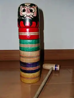 Many children's games make mention of Daruma. In Japanese, snowmen are called "Yukidaruma" (Japanese: 雪だるま), literally snow daruma. Possibly because the shape is related to Daruma, they usually only have two sections instead of three.[2] Darumasan ga Koronda is an equivalent to the American Red Light/Green Light game. Daruma Otoshi (だるま落とし) is a traditional game played with a daruma doll in five pieces, usually in the colors of the rainbow, from top to bottom: head – a man's face, blue, green, yellow, red. The game is played by using a small hammer to hit each of the colored pieces, from bottom to the top, without letting the pieces fall during the game.