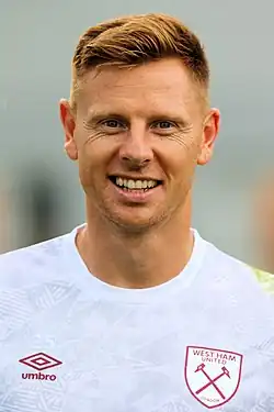 On 3 June 2019, Martin signed a two-year contract with Premier League side West Ham United, to provide cover for first choice keepers Łukasz Fabiański and Roberto.[26] Martin made his West Ham and Premier League debut on 30 November 2019 after Fabiański picked up an injury and Roberto was dropped due to poor form, keeping a clean sheet in a 1–0 away win against Chelsea;[27] a performance which Martin later described as the best day of his life.[28] At the end of the 2020–21 season, Martin signed a one-year contract extension, seeing him undertake a player-coach role for the 2021–22 season.[29] In May 2022, West Ham announced that Martin would be leaving the club at the end of his contract in June 2022.[30]