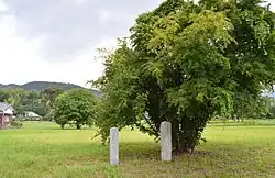 Archaeological excavations starting in 1969 found the foundations of four buried-pillar buildings. Two are thought to be one-by-two bay warehouse-style buildings, and one was a four-by-seven bay building with eaves extending north and south, that is thought to be the central building. It is estimated that this building dates back to the first half of the Heian period. Seven buried pillar foundation buildings, a north–south ditch, and the remains of an earthen rampart-like structure were discovered on the eastern side of the site. The buildings were rebuilt three times, with the oldest foundations dating from the latter half of the Nara period. The north–south ditch existed from the Heian period into the Muromachi period. The complete extent of the site has yet to be determined.[2]