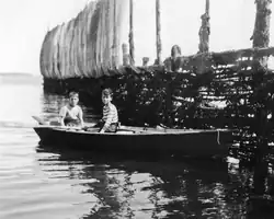 Boys attending a fishing weir off Deer Island, 1949