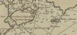 The origin of the name is attributed to a Passamaquoddy legend about the island being a deer chased by wolves represented by the Wolf Islands.[18] The name "Deer Island" is found on the 1764 Mitchell's Fieldbook, and the Passamaquoddy name is presumed to be a translation of the English.[20] The natives referred to the lower end of the island as "Peelsquess", "girl", for the shape of a rock in the water.[20]