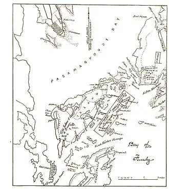 In 1762 the colony of Massachusetts, and in 1767 the colony of Nova Scotia, began cautiously settling the area as the Passamaquoddy were now friendly and open to trade.[11] Josiah Heney, John Frost, Alexander Hodges and James Parsons were among the first Loyalist settlers in 1763, building homes near Pleasant Point although legally squatters without title.[21][22] In 1964, Reginald Richardson was scuba-diving and discovered the wreck of an unidentified colony ship with its cannonade, wine and anchor near the Sandy Island ledges off Deer Island, dated between 1770-1790.[6][23][24]