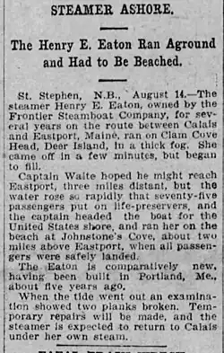 1908 newspaper clipping about a steamboat running aground at Clam Cove, Deer Island