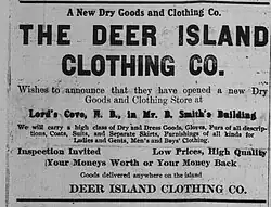 In 1876 there was a store at Cummings Cove, another at Bar Island, another at Fairhaven and two at Lord's Cove although mercantile trade was also operated out of private homes,[14] and by 1908 there were two general stores in Leonardville.[27] Following his father's success, a son of Grand Manan's John Cook opened a satellite lobster factory on Deer Island but it soon faltered.[14] Although there was a single post office at Cummings Cove in 1868 it served only a quarter of the island and as late as 1870, Wealthy Brooks Butler noted most of the island relied on inconsistent monthly deliveries coming through Eastport - leading the 1876 diversion of the new mailship Stroud to stop at Campobello and Deer Island before reaching Grand Manan.[51] From 1903-1969, a post office operated at Chocolate Cove.[116] By 1878 there were post offices in Fairhaven and Lord's Cove.[51]