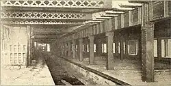 The underground terminal for the subway adjacent to the trolley terminal opened on September 16, 1908. The station initially contained only two tracks which ended at the west end of the station. It also had an additional southern side platform adjacent to the trolley terminal, with the station organized in a Spanish solution.[15] The station was rebuilt for through service from 1911 to 1913 for the Centre Street Subway to extend to Chambers Street. The station's platforms originally could only fit six 67-foot-long (20 m) cars. In April 1926, the New York City Board of Transportation (BOT) received bids for the lengthening of platforms at three stations on the Centre Street Loop, including the Essex Street station, to accommodate eight-car trains.[18] The New York City Board of Estimate approved funds for the project in July 1926,[19] and the extensions were completed in 1927, bringing the length of the platforms to 535 feet (163 m).[20][21]
