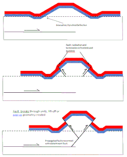 Symmetric faults were essentially covered previously under the name ‘lift-off’ folds, see Figure 4. Progressive limb rotation and lock-up in a symmetric fold induces shear at both the forelimb and backlimb of the fold which may then result in faults on both limbs causing lift-off. Like the asymmetric fold faulting, as progressive slip along the basal detachment occurs, either the forelimb or backlimb (the limb closest to the source of thrust) thrust may reconnect with the basal detachment.[15] For a more robust definition of faulting reference Mitra 2002.[4][15]