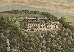 The area was once part of the Hafod Estate, owned by Thomas Johnes who built a small hunting lodge on the estate which was eventually expanded into an inn. The building burned down and was rebuilt.[11] Significant renovations were completed in 1837–1839 and in the 1860s. After several expansions and upgrades, it has been operated as the Hafod Hotel, using this name since the 1860s. In 2017, new owners had arranged for a survey in preparation for a major renovation; they intended to maintain much of the historical character of the building.[12][13] Some interior renovation work had been completed by September 2017.[11]