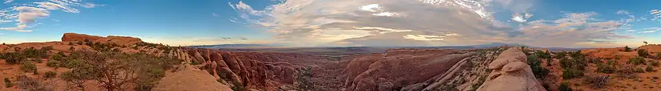 Devils Garden[note 1] is an area of Arches National Park, located near Moab, Utah, United States,[2] that features a series of rock fins and arches formed by erosion.[3] The Devils Garden Trail, including more primitive sections and spurs, meanders through the area for 7.2 mi (11.6 km).[4] The trailhead leads directly to Landscape Arch after a 0.8 mi (1.3 km) outbound hike, while Tunnel Arch and Pine Tree Arch can be seen on spur trails on the way to Landscape Arch.[3] Several other arches, including Partition, Navajo, Double O, and Private Arch, as well as the Dark Angel monolith and Fin Canyon, are accessed via the primitive loop trail and its spurs.[3]