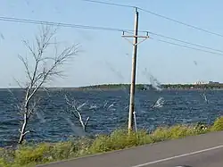 Devils Lake is the endorheic, or closed, lake of a drainage basin of some 3,800 sq mi (9,800 km2), the Devils Lake Basin. The lake collects around 86 percent of the basin's water runoff.[9] Above an elevation of 1,447 ft (441 m) AMSL, the lake spills into neighboring Stump Lake. At 1,458 ft (444 m), the combined lake flows naturally into the Sheyenne River, though the lake has not reached this level in approximately 1,000 years.[10] The Sheyenne River is a tributary to the Red River, which flows into Canada, with eventual exit into the Hudson Bay.[9] Dike protection is set at 1,454 ft (443 m).