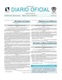 The Diario Oficial is the official journal of the Government of Colombia that contains the laws, decrees, acts, and most pertinent documents and public notices of the President, Congress, and government agencies of Colombia. It is a daily (except holidays) publication, and was established on 28 April 1864 by means of an executive decree issued by President Manuel Murillo Toro;[1] its first issue appeared on 30 April 1864, publishing the legal information of the day before.