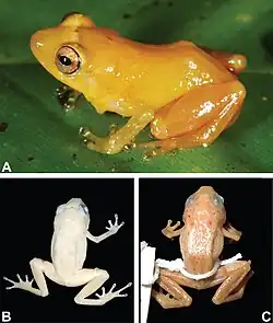 Adult males measure 17–19 mm (0.67–0.75 in) in snout–vent length. The head is as long as it is wide. The snout is subovoid in dorsal view and rounded in lateral view. The tympanum is distinct. The fingers and toes have expanded disks but lack lateral fringes and webbing. The dorsum has low pustules whereas the venter is shagreen. The upper surfaces of the body are light yellow with dark dots, sometimes forming blotches by aggregation. The venter is white and the throat is cream. The upper surfaces of thighs are pinkish orange and have dark dots, while the lower surface of thighs are uniformly pinkish orange. Males have single external vocal sac and vocal slit.[3]