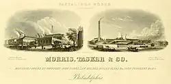 During the 19th century, Pascal Iron Works was situated in the squares between Moyamensing road and Fifth street, and Franklin (later Tasker) and Morris streets,[6] then only the block between Fourth and Fifth streets. Stephen Paschall (1800-1865) formed Paschall Iron Works in 1821. In 1835 he was joined by his brother, Henry Morris, and Thomas T. Tasker, a Philadelphia preacher with a penchant for mechanics, to form S. P. Morris & Company. Sometime between 1835 and 1856, S. P. Morris & Co. became known as Morris Tasker & Morris, when another brother, Wistar Morris (1815-1891), took the place of retiree Stephen Paschall. By 1856, the organization's name had changed once more to Pascal Iron Works and Morris, Tasker & Company. These companies manufactured a number of different iron products throughout the 1800s, including stoves, grates, pipes, valves, fountains, radiators, and fire hydrants.[7][8][9]