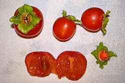 Diospyros kaki, the Oriental persimmon,[2] Chinese persimmon, Japanese persimmon or kaki persimmon,[3] is the most widely cultivated species of the genus Diospyros. Although its first botanical description was not published until 1780,[4][3] D. kaki cultivation in China dates back more than 2000 years.
