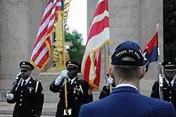 The pictures below depict the DCARNG Honor Guard participating in Memorial Day ceremonies, held at President's Park, in Washington, DC, during 2018 and 2019. The DCARNG Honor Guard supported the 1st Infantry Division's Memorial Day annual ceremony.[14] In a few pictures shown below, Honor Guardsmen are playing "Taps", giving a three-volley salute, and standing ready to give military honors to fallen comrades.