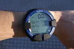 A dive computer, personal decompression computer or decompression meter is a device used by an underwater diver to measure the elapsed time and depth during a dive and use this data to calculate and display an ascent profile which, according to the programmed decompression algorithm, will give a low risk of decompression sickness.[1][2] A secondary function is to record the dive profile, warn the diver when certain events occur, and provide useful information about the environment. Dive computers are a development from decompression tables, the diver's watch and depth gauge, with greater accuracy and the ability to monitor dive profile data in real time.[3]