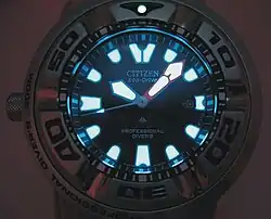 The dials and markers on the watch face and bezel have to be legible under water and in low light conditions. An indication that the watch is running in total darkness also has to be present. For easy legibility most diving watches have high contrasting, non-cluttered dials and markers with a large, easily identifiable minute hand. The markers for 3, 6, 9 and (especially) 12 o'clock on the watch face and the zero marker on the bezel of analogue diver's watches are usually conspicuously styled to prevent disorientation induced read out errors. A styling of the hands where no hand can temporarily totally overlay and hence obscure the position of another hand is also desirable to promote constant legibility and prevent read out errors. For low light conditions luminous phosphorescent non-toxic strontium aluminate based lume pigments marketed under brand names like Super-LumiNova, Lumibrite or NoctiLumina and tritium based self-powered lighting devices called "gaseous tritium light source" (GTLS) are applied on the dials and markers. On digital diving watches, lighted displays are used for legibility under low light conditions.