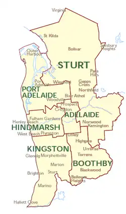 Current boundaries see Sturt covering an area of approximately 97 km² east of the city, from Oakden and Hope Valley in the north to Glen Osmond in the south, taking in the foothills of the Mount Lofty Ranges. Suburbs include Athelstone, Burnside, Campbelltown, Dernancourt, Frewville, Gilles Plains, Glen Osmond, Glenside, Glynde, Hectorville, Highbury, Hillcrest, Holden Hill, Hope Valley, Kensington, Klemzig, Magill, Marden, Oakden, Paradise, Tranmere and parts of Payneham and Rostrevor.