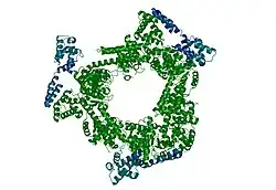Bacillus stearothermophilus DnaG, blue, in complex with the hexameric DnaB, green. Rendered from PDB 2R6A