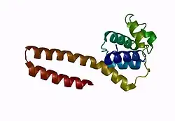 The structure of E. Coli's helicase binding domain. Rendered from PDB 2R6A. The lower two helices form the helical hairpin of the C2 subdomain. The remaining five helices form the helical bundle of the C1 subdomain.