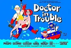 Doctor in Trouble is a 1970 British comedy film, the seventh and last film in the Doctor series. The film was directed by Ralph Thomas and stars Leslie Phillips as a doctor who gets accidentally trapped on an outgoing cruise ship while it begins a round the world trip. The cast was rounded out by a number of British comedy actors including James Robertson Justice, Harry Secombe and Angela Scoular.[2] The film was based on the 1961 novel Doctor on Toast by Richard Gordon, and is unrelated to the 1964 novel bearing the same title written by Clare Cavendish.