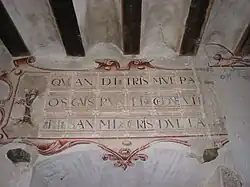 {1576}: Date on frescoed "phylactery" (in the sense of a scroll of text) on the second floor of the northeast corridor of the convent, located above the door that connected this room with the northern staircase of the church. The Latin text is in arranged in boxes (as a false stoichedon) and reads vertically: "QVOS ANGVIS DIRVS TRISTI MULCEDINE PAVIT" (first and second lines) "HOS SANGVIS MIRVS CHRISTI DULCEDINE LAVIT" (third and second lines). Both sentences, read together, translate as: "Those whom the dark serpent has fed with terrible balm, the miraculous blood of Christ has sweetly washed". To the left of the epigraph is represented the serpent coiled around the Tree of Paradise (the same zigzag reading would allude to the shape of the reptile). On the right is a lost painting, presumably of Christ on the cross, as part of an arm of the cross and a nail are still visible. The authorship of this text, with slight variations, seems to be due to the Goliardesque poet Hugo Primas de Orleans (1094? - 1160), who used it as a symbol of the union of the Old and New Testaments: Quos anguis tristi virus mulcedine pavit; hos sanguis Christi mirus dulcedine lavit. However, the same readings can be found in texts such as the Album Joannis Rotarii by Johan Radermacher de Oude (1538-1617), which maintains the crossed sense of this reading, but this time diagonally, or in a marginal note on the back of folio 276 of the Codex Gigas (13th century).