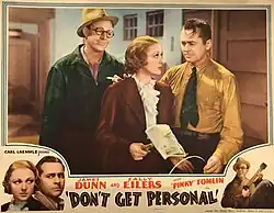 Don't Get Personal is a 1936 American comedy film directed by William Nigh and written by George Waggner, Clarence Marks and Houston Branch. The film stars James Dunn, Sally Eilers, Pinky Tomlin, Spencer Charters, Doris Lloyd and George Cleveland. The film was released on February 12, 1936, by Universal Pictures.[1][2][3]