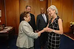 In 2015, Shalala took a leave of absence from her tenured professorship at the University of Miami to volunteer for the Clinton Foundation.[33] She followed her tenure as president of the University of Miami by being named chief executive officer of the Foundation,[34] serving in that capacity from 2015 to 2017.[35][36]